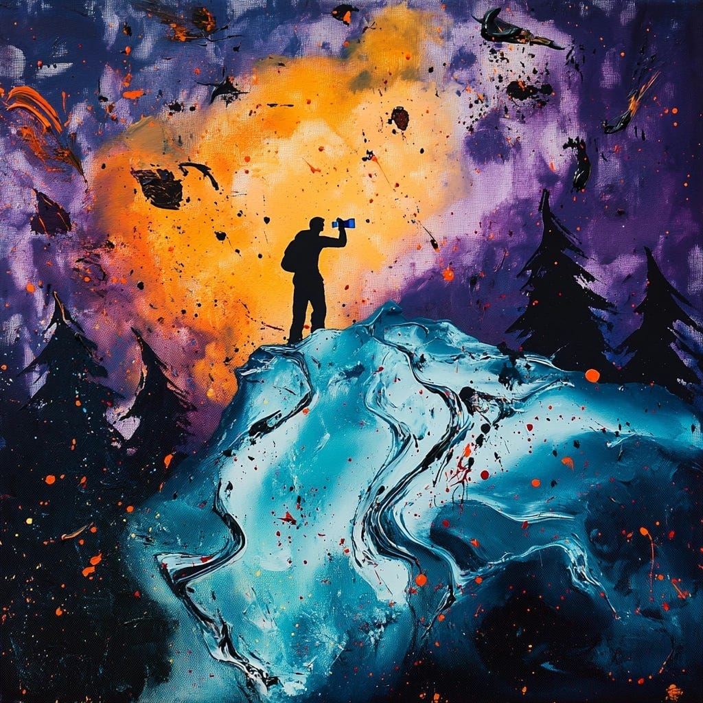 Remember that glacier, how restless you felt in its presence. Remember how you yearned for something grander, to escape this uncomfortable, mundane moment, to climb those peaks. Those summits were steep, icy, and clearly dangerous, yet they called to you, seductively validating the story lurking behind your restlessness. Staring up at those frosted fortresses, daydreaming about the view from above, you began to believe the only way to feel okay in life is to seek the highest ground, to take as much control as possible. You felt so small in that valley, so vulnerable, with its limited visibility. The unease in your chest grows stronger as you move closer to the glacier. Once there, in that frozen place, you feel possessed by an irrational and urgent need to flee.